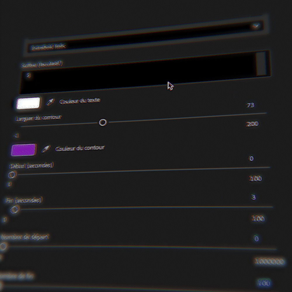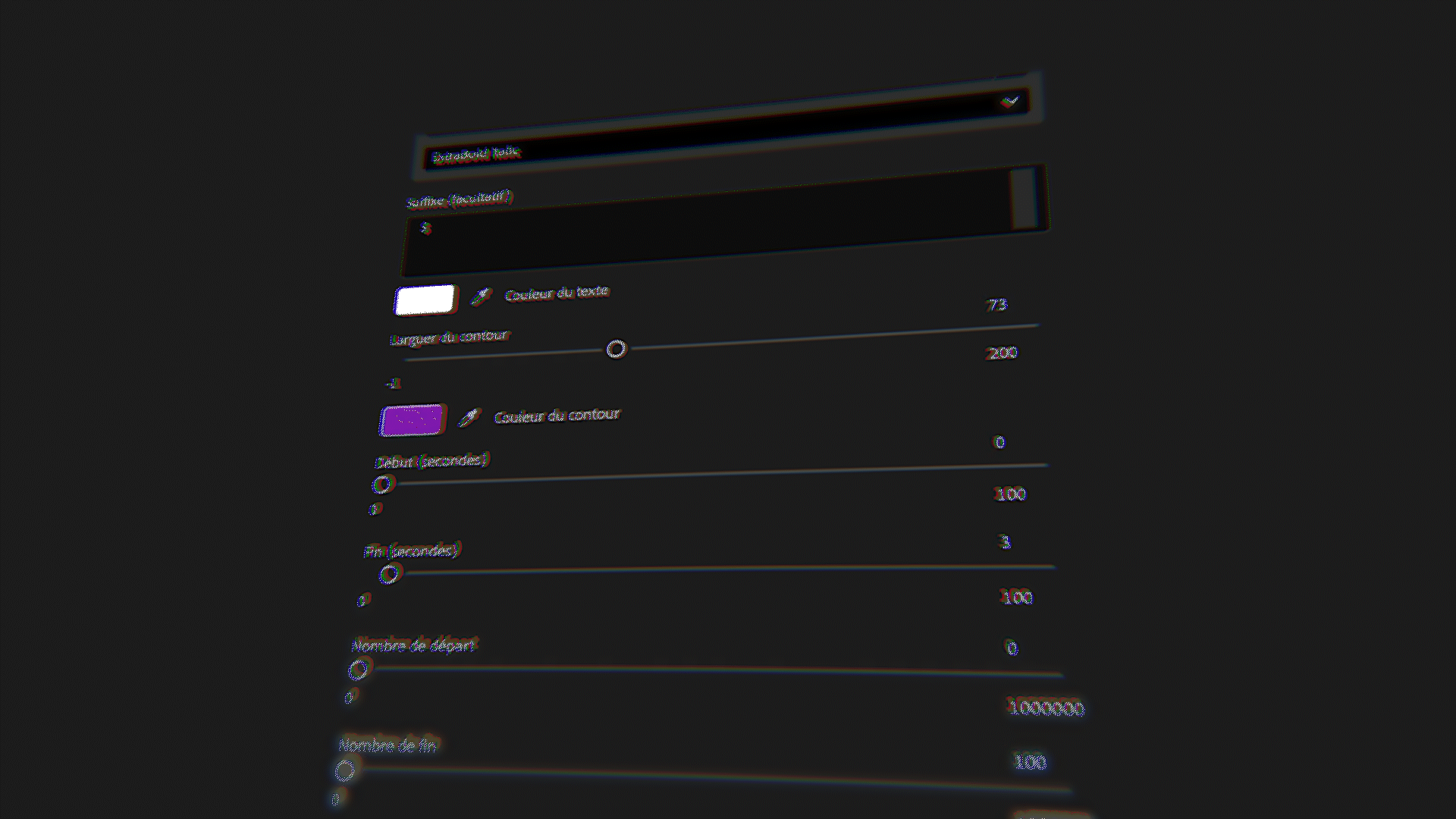 (Police d'écriture, couleur, contour, timecode du début, timecode de fin, nombre de début, nombre de fin, lissage, flou de mouvement)